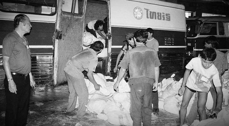 แต่เหมือนโชคร้ายจะยังไม่จบลงแค่นั้น ในปีพ.ศ.2519 ช่วงวิกฤติ 6 ตุลา สำนักพิมพ์ไทยรัฐถูกยิงถล่มด้วยเครื่องยิงระเบิด เอ็ม 79 ส่งผลให้กันสาดของตึกอำนวยการได้รับความเสียหาย มีรอยแตกร้าวไม่น้อยกว่า 10 เซนติเมตร แต่ที่ร้ายแรงกว่าคือ แรงระเบิดนั้นทำให้กระจกรถส่งหนังสือพิมพ์ซึ่งจอดรอรอบตึกแตกร้าวไปไม่น้อยกว่า 10 คัน